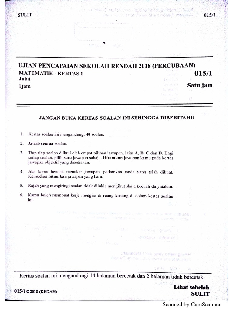Soalan Percubaan Upsr 2018 Matematik Negeri Kedah Kertas 1 Pdf Pdf